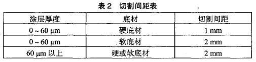 附著力檢驗運用的劃線器,選用由碳鎢合金材料制成的標準百格刀;膠帶用3M 600號,2 cm寬膠帶(在45。方向拉一次檢驗),附著力應達到GB 9286規則的二級要求。